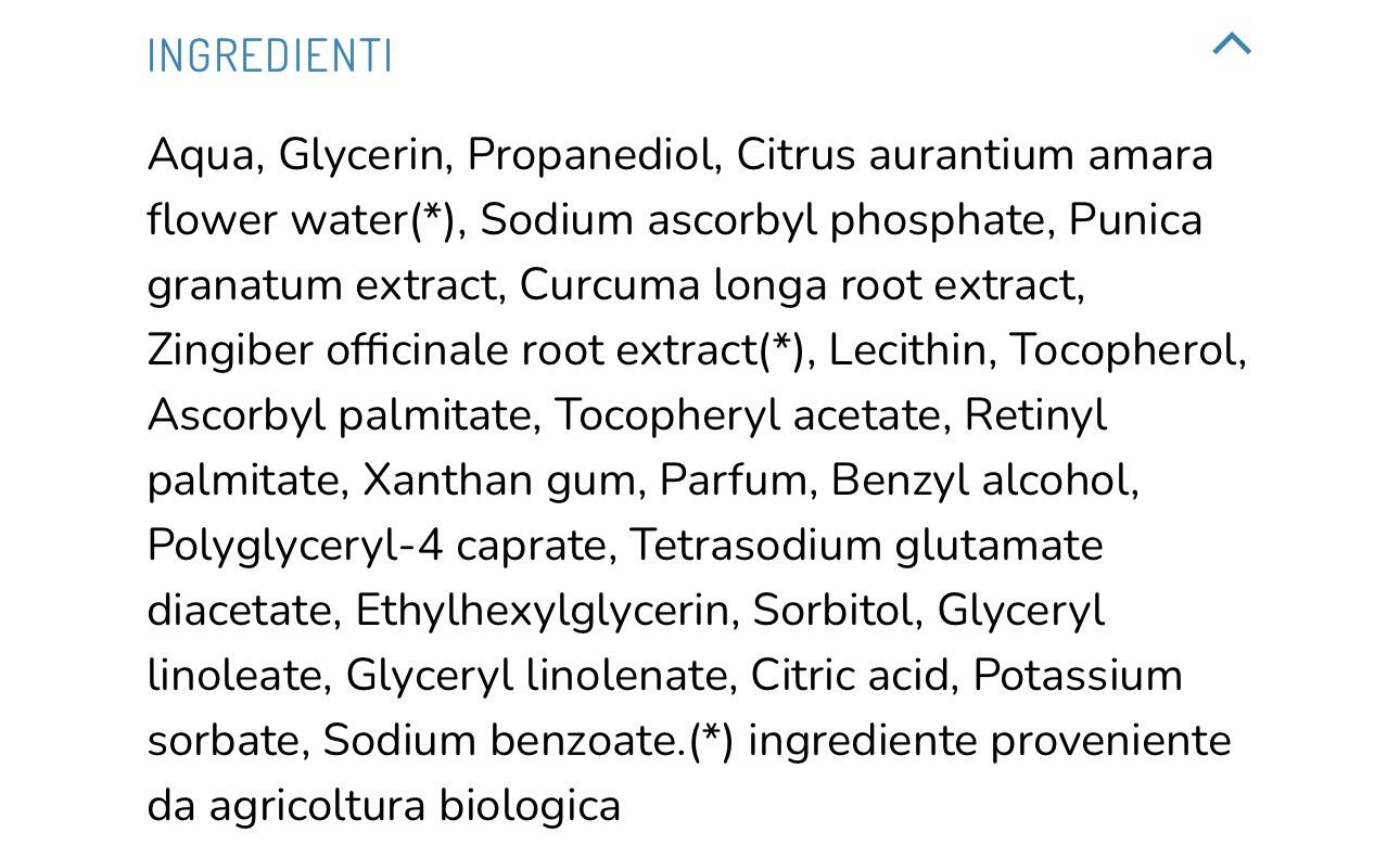 Siero viso conVitamina CeAcqua di Fiori di Arancio Biologica, ad azioneantiossidanteedilluminante, in sinergia con unComplesso Multivitaminicocostituito davitamine stabilizzate protette da vescicole liposomiche. Tali vitamine hanno un'azioneantiossidante,antiage,rigeneranteeprotettiva.